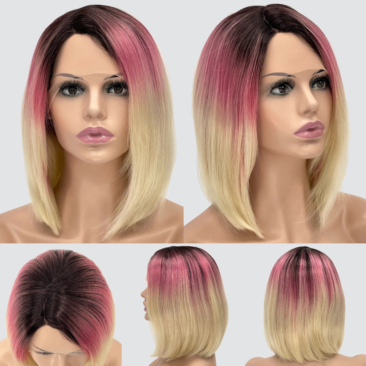 Перука каре без гривки на сітці, термоволосся, колір блондин з переходом від темного коріння до рожевого