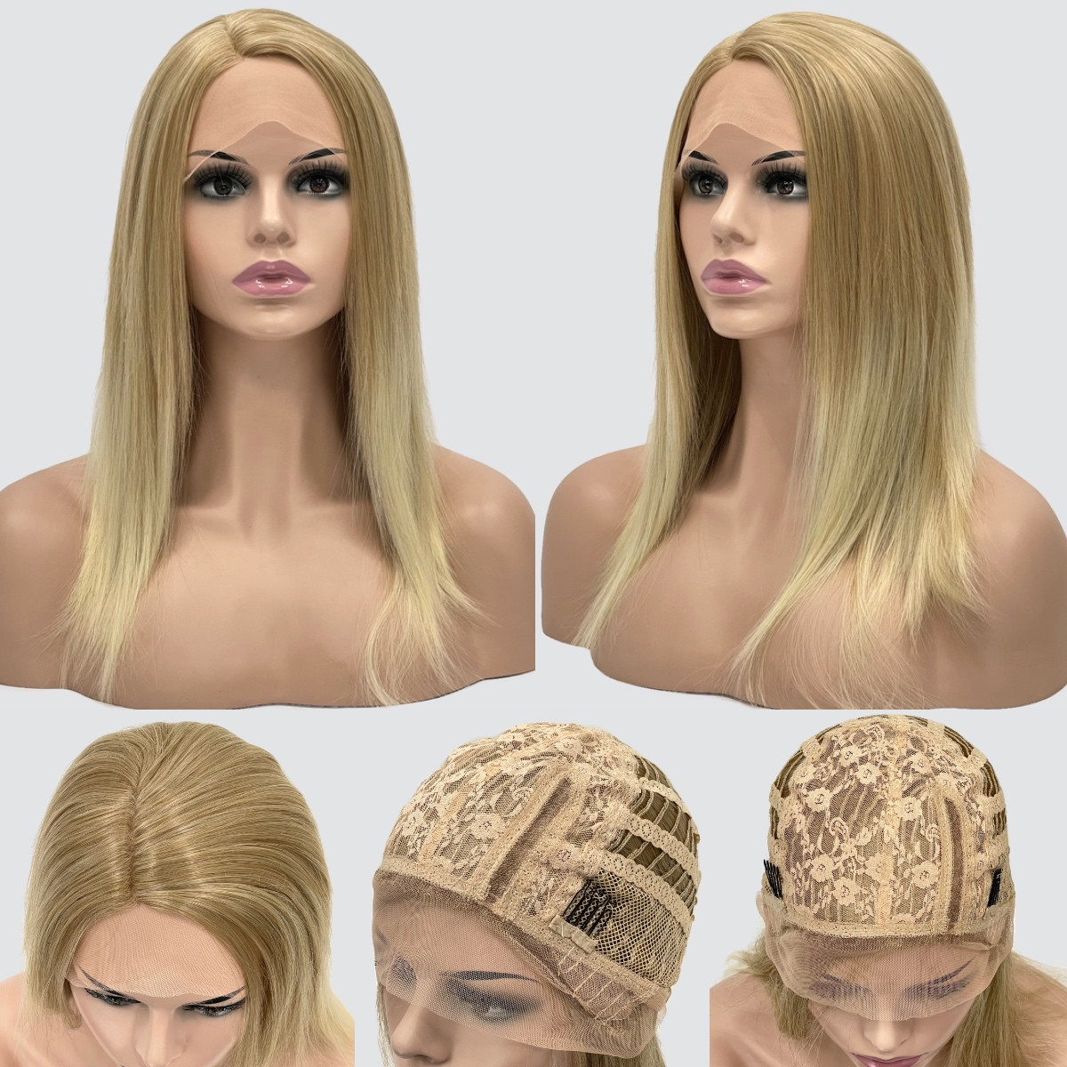Перука каре без гривки Lyryca Lace на сітці, термоволосся, колір блондин з освітленими кінцями